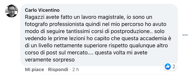 "L’Accademia del Fotoritocco è una figata assurda, il corso è utilissimo ed insegna il fotoritocco in ogni piccolo dettaglio, in più c'è il tutor sempre a disposizione!"
